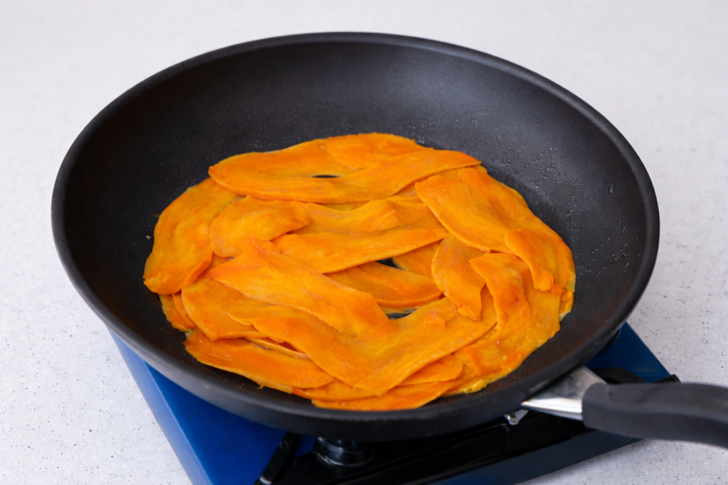 Leg de zoete aardappellinten in een cirkel van buiten naar binnen totdat de bodem volledig bedekt is.