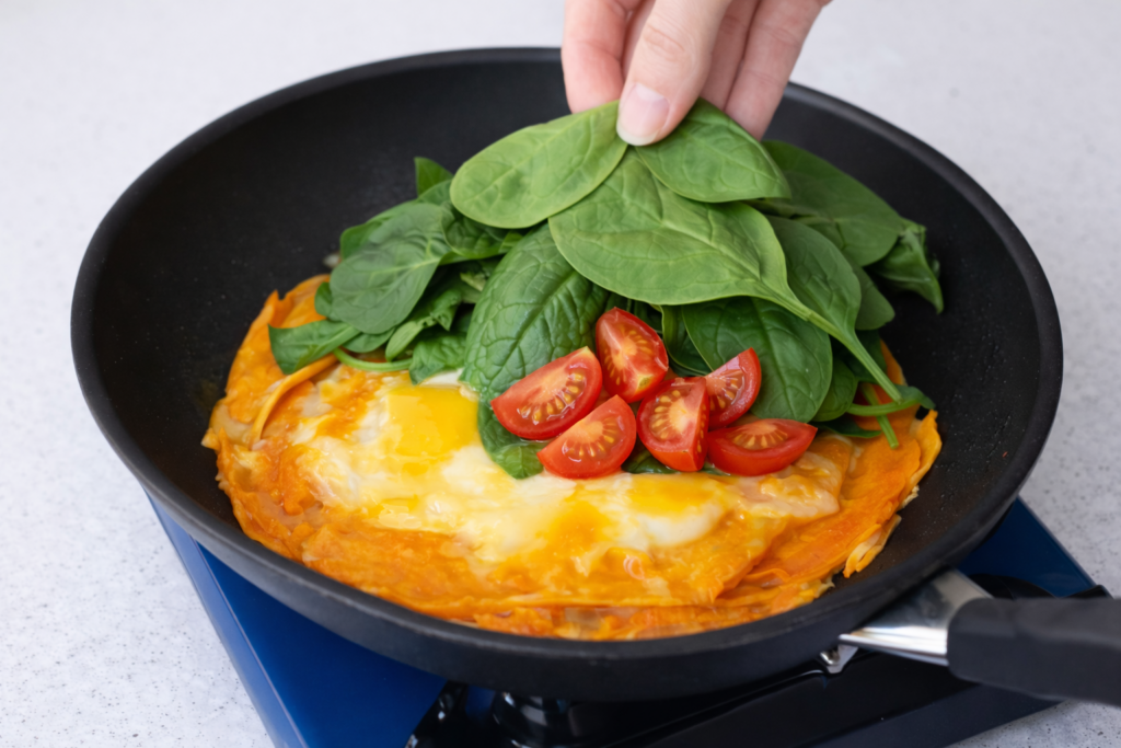 Verdeel de spinazie over het ei (die slinkt vanzelf).